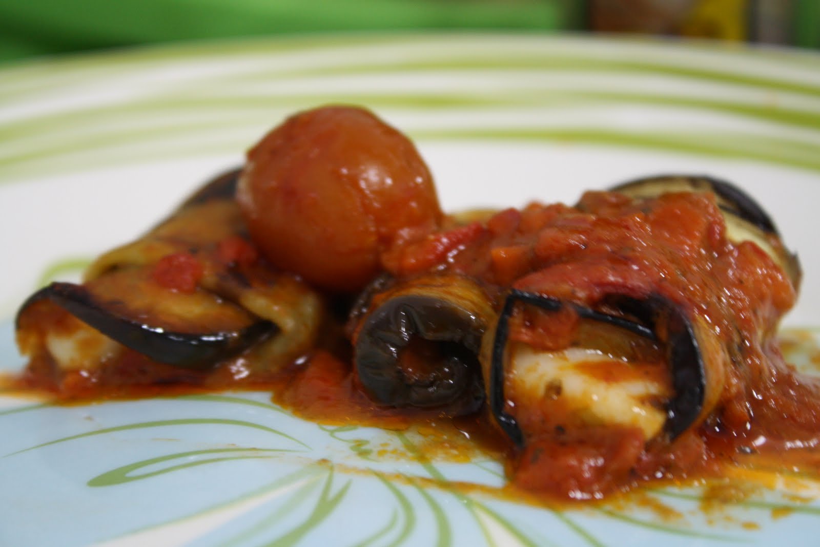 Amigas, para duas pessoas, pegue uma berinjela, a mais comprida que encontrar. Se for fazer pra mais gente, aumente a quantidade de berinjela e queijo. Lave, seque e corte fatias bem fininhas. Coloque um pouquinho de sal e pimenta do reino e grelhe rapidamente cada fatia em algumas gotinhas de azeite. Assim que esfriar, corte palitos de queijo de cabra e enrole a berinjela neles. Não precisa comprar um tamanho muito grande de queijo, usa muito pouco. Arrume os rolinhos em um refratário para levar ao forno. Por cima coloquei um molho de tomate que comprei no Pão de Açúcar. Ele é feito com tomatinhos cerejas e são uma delícia. Coloque um pouco de molho de tomate por cima e leve ao forno por uns 12 minutos, ou até você perceber que o queijo começou a derreter.