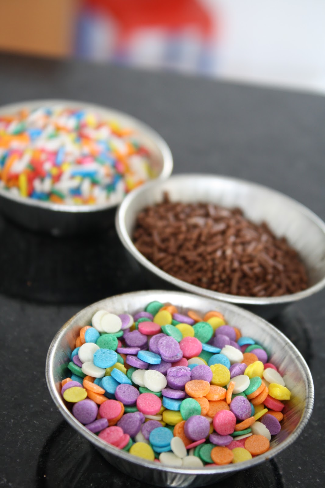 – Depois de tirar da geladeira cubra com o chocolate derretido, branco ou preto, como preferir e em seguida coloque os confeitos,