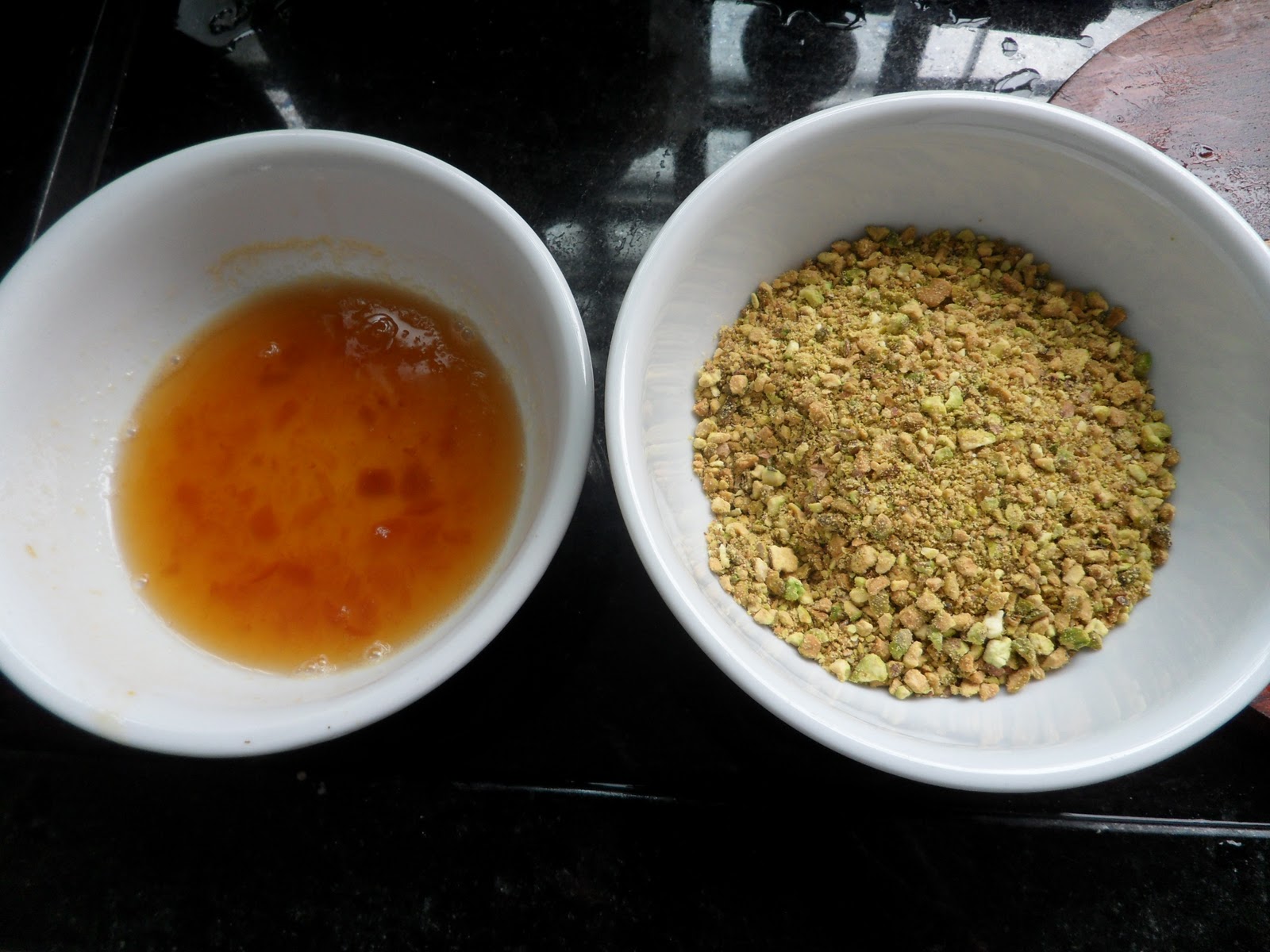 Fiz da seguinte forma: passei o pedaço de frango na geléia (não importa se ainda estiver um pouco quente) e sem seguida passei no pistache. Pra cada pedaço é necessário lavar e secar as mãos para o pistache não grudar nas mãos. Depois de empanar todos, coloquei em um refratário com o fundo levemente salpicado de azeite. Por cima dos filés, no meio de cada pedaço, coloquei o restante da geléia de damasco. Fiquei preocupada se o frango ia ficar seco ou assar por forma e não por dentro. Fique atenta (o), o forno deve estar a 180 graus, não mais que isso e pode colocar a travessa na parte de cima.
