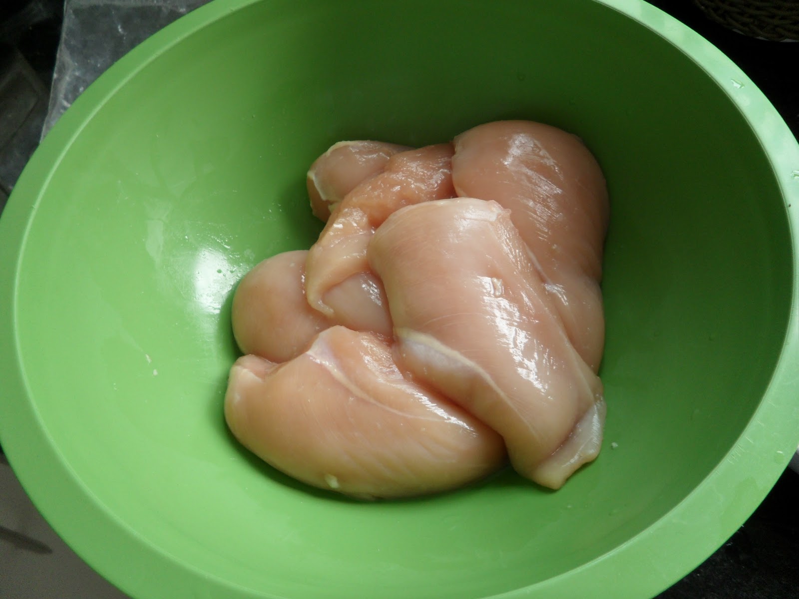 Pra isso, usei dois peitos de frango sem osso e bem limpos. Antes de tudo, eu os temperei com tempero pronto e deixei marinando. Cuidado nessa hora, eu usei bem pouco, de um jeito que achei que ia ficar sem sal. Isso é importante pra poder destacar sempre o pistache.
