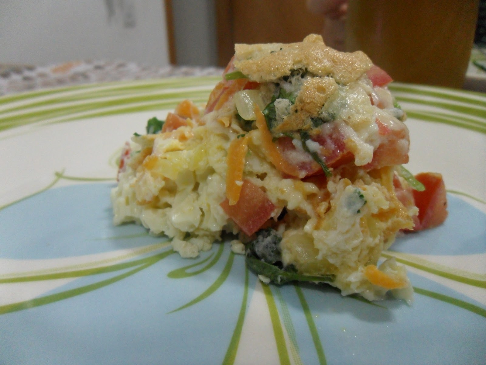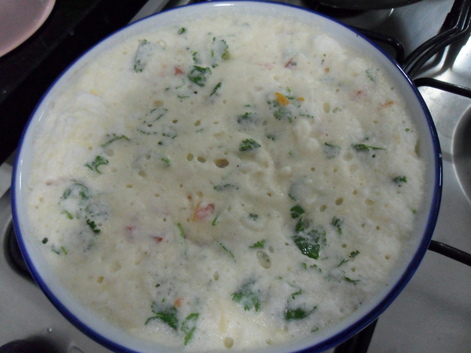 Enquanto os ingredientes acima vão refogando você pode ir batendo as claras em neve. No mixer ou batedeira é rapidinho. Aqui em casa usei o mixer e quem bateu foi o maridão, rsrs! Quando estiver nem neve, ou seja, vire a vasilha pra baixo ela não cai, misture devagar, com cuidado, mas misture, o queijo, salsinha e cebolinha. Jogue um pouco de azeite em uma travessa de ir ao forno média. Coloque primeiro o refogado e por cima coloque a mistura de clara em neve com gemas e queijo. Leve pra assar em forno a 180 graus por uns 20 minutos. Vai olhando, quando em cima estiver bem coradinho é porque está pronto.